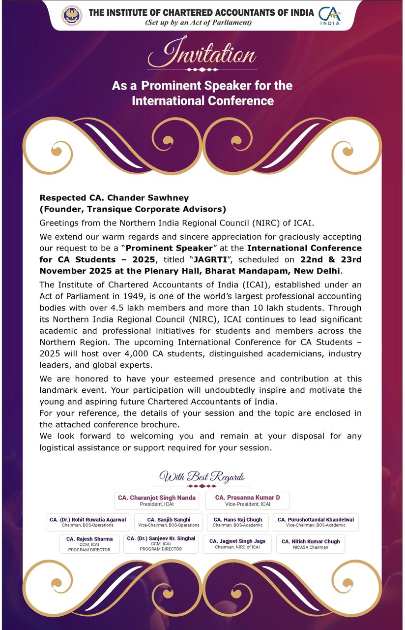 We are pleased to inform that Our Founding Partner & Head – Valuation & Deals, Mr. Chander Sawhney has been invited as a prominent speaker at the International Conference for CA Students- 2025 titled “JAGRTI” organized by BOS-Operations, ICAI & Hosted by NIRC and NICASA of NIRC of ICAI scheduled to be held on 22nd & 23rd November 2025 at the Plenary Hall, Bharat Mandapam, New Delhi.